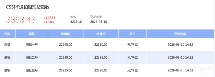 今日,上海华通铂银国标一号银定盘价报22245.00元/千克,结算价收于22350.00元/千克
