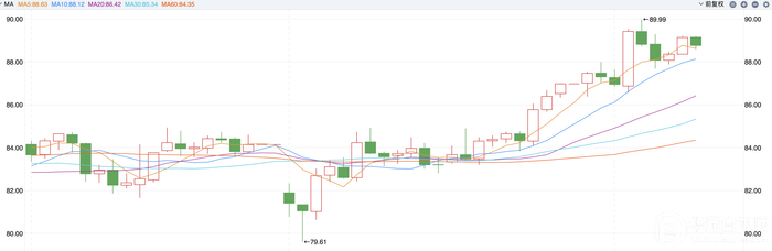 周二现货白银亚市盘从86.50美元心理关口附近的强劲反弹,并在盘中吸引后续买盘跟进。一度上探90美元附近。欧市开盘前银价交投于89美元附近。